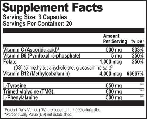 Dopamine Brain Food proporciona estos compuestos esenciales. Contiene precursores de aminoácidos (L-fenilalanina y L-tirosina), cofactores del metabolismo de la dopamina y antioxidantes (vitamina B6, vitamina C y selenio), así como nutrientes específicos para optimizar el ciclo de SAM (folato, vitamina B12 y trimetilglicina) .